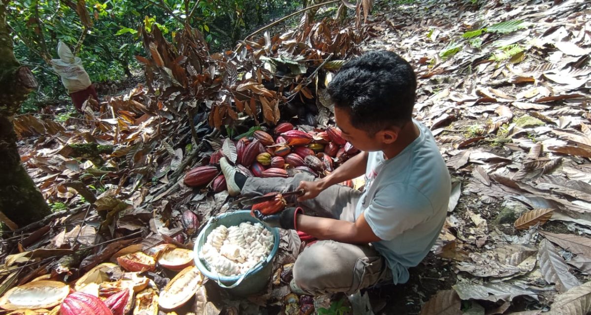 (Beritadaerah-Mamuju) Seorang petani sedang membelah buah kakao di Desa Kabuloang, Dusun Kalilung, Kec. Kalukku, Kabupaten Mamuju, Sulawesi Barat. Kabupaten Mamuju...