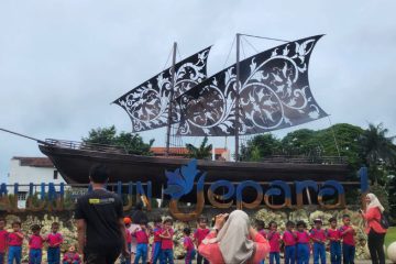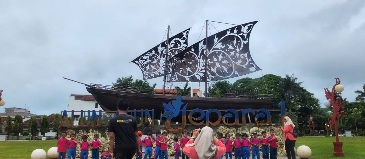 (Beritadaerah-Jepara) Keramaian di Alun-alun Kota Jepara, Jawa Tengah, Kamis (22/1) siang. Tampak anak-anak sekolah yang berfoto di depan replika kapal...