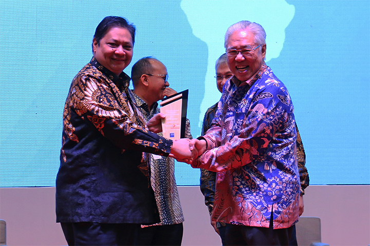 Dalam acara seminar ini, Menteri Perindustrian (Menperin) Airlangga Hartaro juga menjawab pertanyaan dari para audiens dan juga menerima cinderamata dari Menteri Perdagangan (Mendag) Enggartiasto Lukita usai menjadi pembicara pada acara seminar Trade Tourism and Investment Seminar 2019.