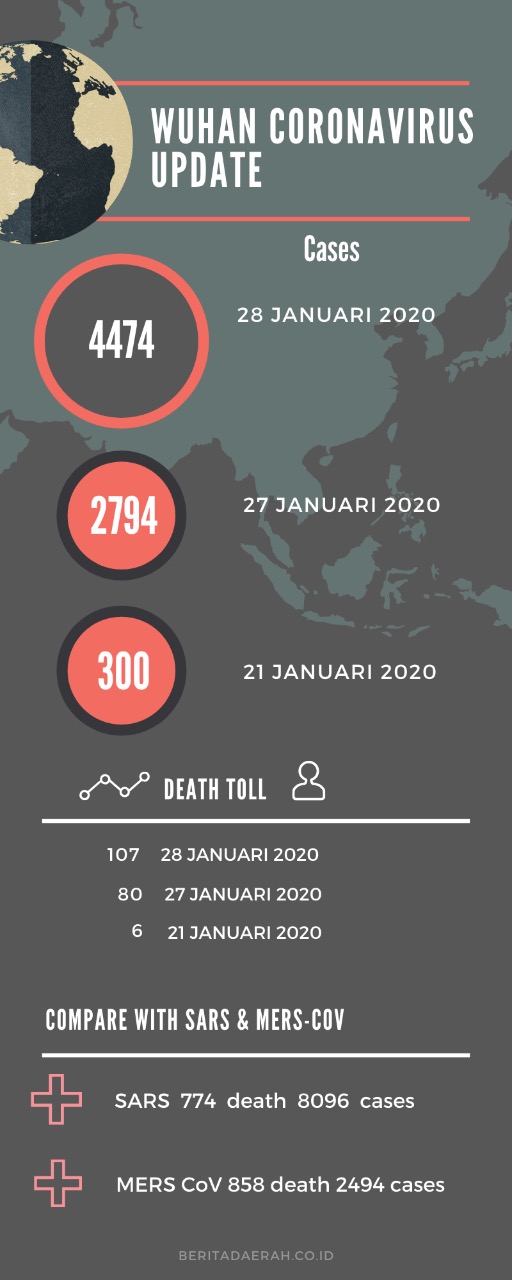 (Beritadaerah – Nasional) Wuhan Coronavirus yang kini bisa termonitor pergerakannya ke seluruh dunia melalui situs JHU CSSE menampakkan keganasannya dari hari ke hari. Menurut JHU CSSE pada hari ini Selasa, 28 Januari 2020 pukul 15.00 telah terjangkit sebanyak 4474 orang dengan 107 meninggal dunia dan 63 orang berhasil mengalami pemulihan. Coronavirus ini telah menjangkiti 18 negara di dunia dengan perincian sebagai berikut: