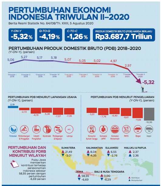 Perekonomian Indonesia berdasarkan besaran Produk Domestik Bruto (PDB) atas dasar harga berlaku triwulan II-2020 mencapai Rp 3.687,7 triliun dan atas dasar harga konstan 2010 mencapai Rp 2.589,6 triliun. Ekonomi Indonesia triwulan II-2020 terhadap triwulan II-2019 mengalami kontraksi pertumbuhan sebesar 5,32 persen (y-on-y). Dari sisi produksi, Lapangan Usaha Transportasi dan Pergudangan mengalami kontraksi pertumbuhan tertinggi sebesar 30,84 persen. Dari sisi pengeluaran, Komponen Ekspor Barang dan Jasa serta Impor Barang dan Jasa mengalami kontraksi pertumbuhan masing-masing sebesar 11,66 persen dan 16,96 persen.