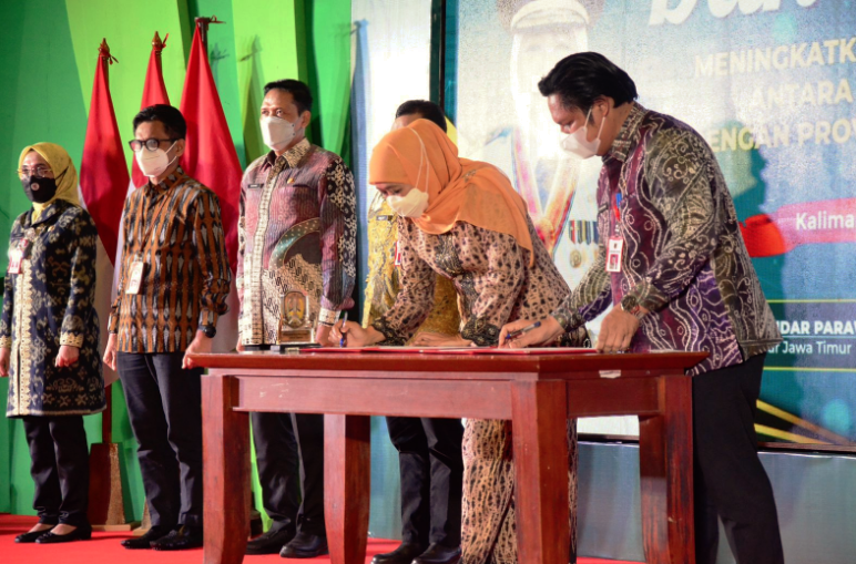 (Beritadaerah – Banjarmasin) Pemerintah Provinsi Kalimantan Selatan dan Pemerintah Provinsi Jawa Timur melakukan kerja sama dagang dan investasi. Sekretaris Daerah Kalsel, Roy Rizali Anwar (kanan), mewakili Gubernur Kalsel dan Gubernur Jawa Timur, Khofifah Indar Parawansa menandatangani kerja sama tersebut di Banjarmasin, Kalimantan Selatan, Rabu (13/4).