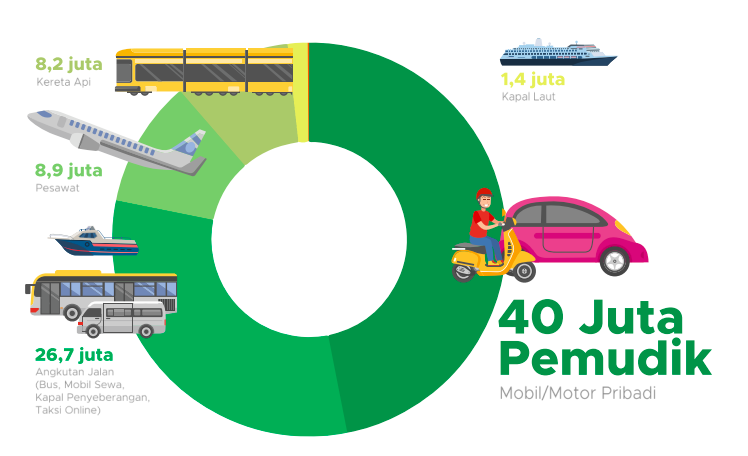 Moda Transportasi yang akan digunakan pemudik? Kendaraan pribadi, baik mobil atau motor mendominasi dengan perkiraan hingga 40 juta orang dari total 79,4 juta orang yang diprediksi akan mudik. Disusul angkutan jalan (bus, mobil sewa, mobil travel, kapal penyeberangan, dan taksi online) mencapai 26,7 juta orang. Sisanya menggunakan pesawat, kereta api, kapal, dan angkutan lainnya.