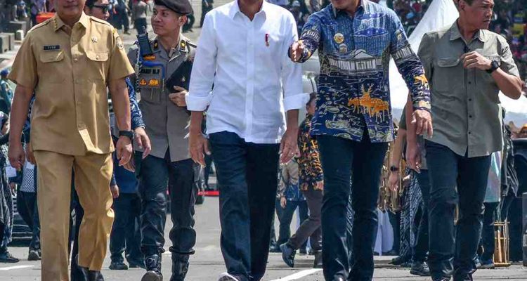 (Beritadaerah-Bogor) Presiden Joko Widodo (tengah) didampingi Wali Kota Bogor Bima Arya (kedua kanan) dan Menteri Dalam Negeri Tito Karnavian (kiri) berjalan bersama menuju lokasi peresmian jembatan Otista, Kota Bogor, Jawa Barat, Selasa (19/12/2023). Revitalisasi jembatan Otista, Kota Bogor yang menggunakan anggaran bantuan Provinsi Jawa Barat sebesar Rp50 miliar dan dikerjakan selama 7,5 bulan tersebut sebagai upaya mengatasi kemacetan di Kota Bogor.