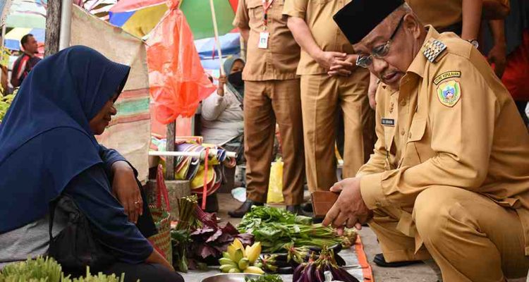 (Beritadaerah – Tidore Kepulauan) Walikota Tidore Kepulauan Ali Ibrahim berbincang dengan seorang penjual saat meninjau harga sembako pada Inspeksi mendadak (sidak) di Pasar Rakyat Sarimalaha yang berada di Kelurahan Indonesiana, Kota Tidore Kepulauan, Maluku Utara (10/1). Walikota Tidore Kepulauan mengatakan sidak dilakukan guna memeriksa ketersediaan stok, harga, serta keamanan dan kebersihan produk yang dijual, sehingga masyarakat dapat membeli sejumlah bahan dan produk dengan harga yang wajar dan terjamin kualitasnya. Harga yang masih tinggi cabai rawit yang dijual Rp50 ribu per kg, sedangkan bahan pokok lainnya berangsur menurun.
