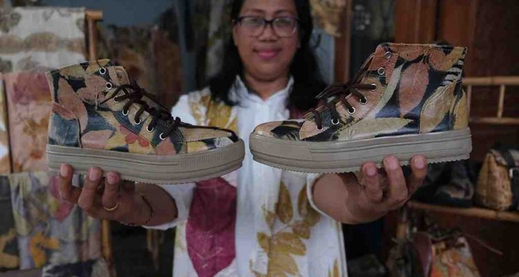 (Beritadaerah-Bali) Perajin menunjukkan produk sepatu yang dibuat dengan bahan pewarna alami dari limbah mangrove dan berbagai jenis daun di Griya Anyar Dewata, Jimbaran, Badung, Bali, Kamis (18/1/2024). Produk kerajinan fesyen yang menggunakan teknik ecoprint pada bahan kain dan kulit dengan pewarna alami tersebut banyak menerima pesanan dari Australia, China, Filipina, Vietnam, Malaysia, Kanada, Amerika Serikat, dan negara-negara Eropa dengan harga Rp100 ribu hingga Rp1,5 juta sesuai jenis, motif, dan inovasi.