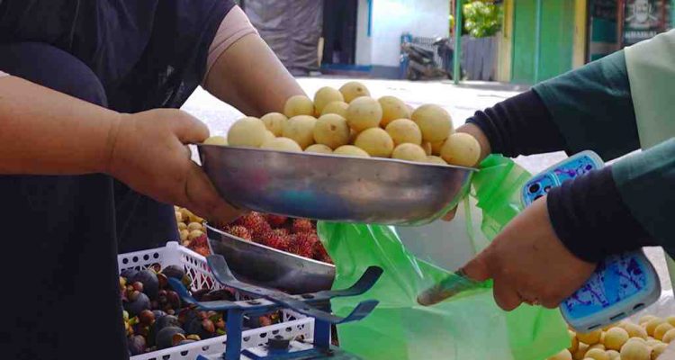 (Beritadaerah – Tidore Kepulauan) Tampak seorang penjual langsat Halmahera memasukan buah kedalam kantong plastik di Pasar rakyat Sarimalaha, Kota Tidore Kepulauan, Maluku Utara, Rabu (31/1/2024). Buah langsat Halmahera, memiliki rasa yang manis dan daging buah yang tebal. Buah langsat Halmahera dijual dengan harga Rp15.000,00 per kg.
