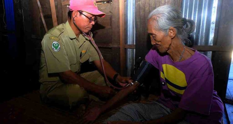 (Beritadaerah – Kalimantan) Tampak Mantri Kesehatan dari Puskesmas Pembantu (Pustu) Sungai Utik Silawanus Tirry Giben (kiri) memeriksa kesehatan warga lansia di Rumah Betang Dayak Iban Manua di Dusun Sungai Utik, Desa Batu Lintang, Kecamatan Embaloh Hulu, Kabupaten Kapuas Hulu, Kalimantan Barat, Selasa (13/2).