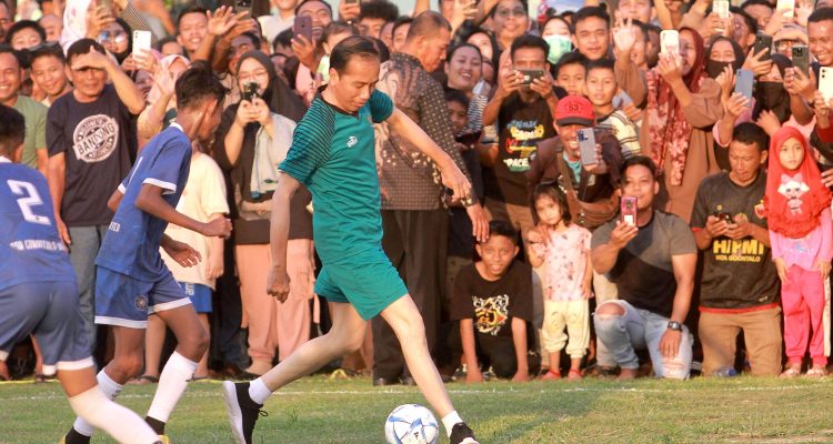 (Beritadaerah-Gorontalo) Presiden Joko Widodo (Jokowi) disela kunjungan kerjanya beberapa hari di Gorontalo, bermain sepak bola bersama tim SSB Gorontalo United. Tampak Presiden Jokowi (kanan) berusaha melewati hadangan pemain SSB Gorontalo United di Lapangan Kompi Bantuan, Kota Gorontalo, Gorontalo, Minggu (21/4/2024). Presiden Jokowi didampingi sejumlah menteri saat bermain sepak bola di Gorontalo.