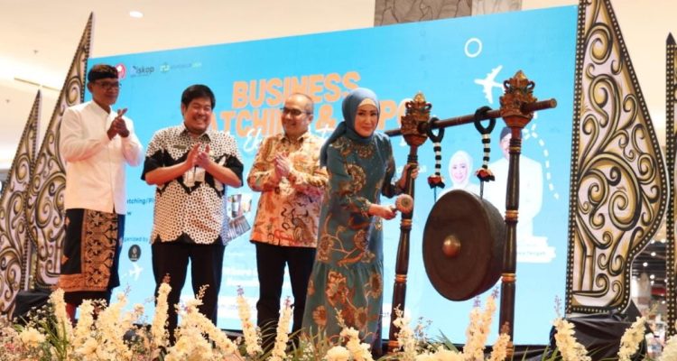 (Beritadaerah-Bali) Tampak Penjabat Ketua Dewan Kerajinan Nasional Daerah (Dekranasda) Provinsi Jawa Tengah Shinta Nana Sujana, membuka Business Matching & Expo (Kontak Bisnis dan Pameran) dalam rangka Pengembangan Pemasaran Produk UMKM ke Pasar Global dengan memukul gong di Provinsi Bali, Sabtu (20/7). Pada hari itu, telah terjalin kesepakatan perjanjian kerja sama B to B, antara tiga UMKM dengan enam buyer senilai Rp23,21 miliar.