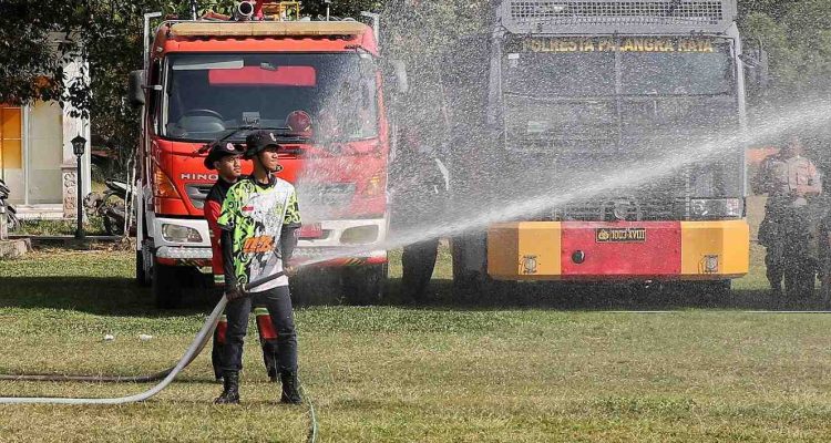 (Beritadaerah-Palangka Raya) Tampak beberapa petugas yang melakukan simulasi pemadaman kebakaran hutan dan lahan (Karhutla) di halaman Kantor Wali Kota Palangka Raya, Kalimantan Tengah, Selasa (30/7). Kegiatan ini merupakan rangkaian Apel Siaga dan Gelar Peralatan Menghadapi Karhutla yang diikuti anggota TNI, Polri, BPBD, dan relawan pemadam kebakaran.