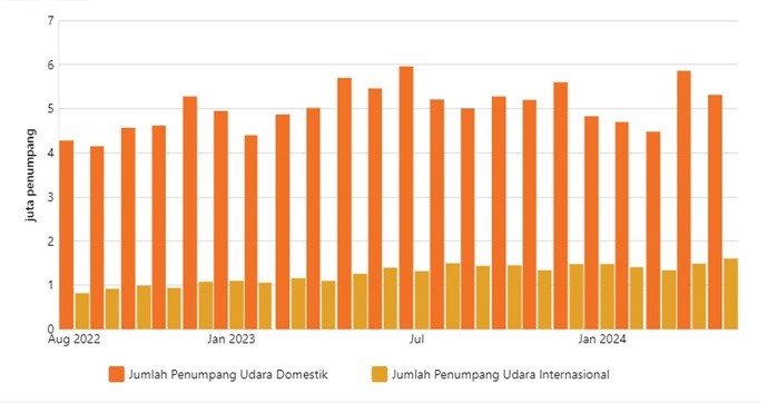 Untuk penumpang angkutan udara domestik, selama Januari–Mei 2024, jumlah penumpang domestik sebanyak 25,2 juta orang.
