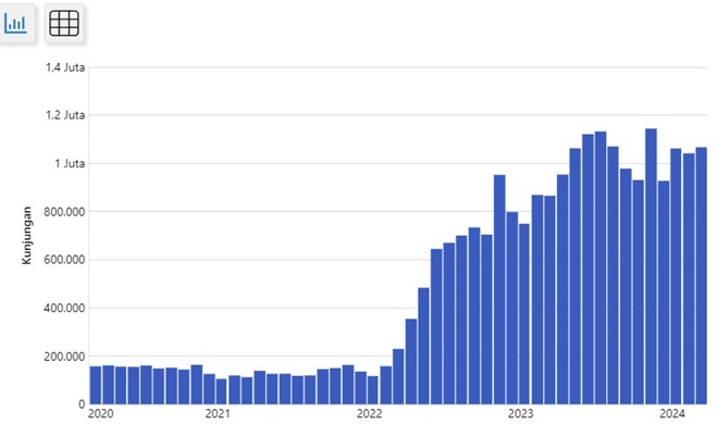 Badan Pusat Statistik (BPS) mencatat jumlah kunjungan wisatawan mancanegara (wisman) ke Indonesia meningkat pada Mei 2024. Jumlahnya mencapai 1.145.499 kunjungan, naik 7,36% secara bulanan dan naik 20,11% secara tahunan.