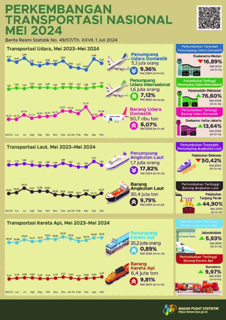 Sedangkan untuk transportasi udara, menurut Laporan Badan Pusat Statistik (BPS) menunjukkan, jumlah penumpang angkutan udara domestik pada April 2024 menyentuh 5,86 juta orang atau naik 30,63% dibanding Maret 2024 yang sebesar 4,48 juta penumpang.