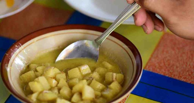 (Beritadaerah-Gorontalo) Seorang pengunjung menyendok sayur lambi pilitode di rumah makan Fajar, Jalan Trans Sulawesi, Kabupaten Gorontalo, Minggu (3/11/). Pilitode adalah salah satu jenis makanan berkuah khas Gorontalo. Pilitode diolah dari santan yang ditumis dengan sejumlah bumbu. Pilitode biasanya diolah untuk lauk dan sayuran. Lambi pilitode diolah dari pisang mengkal. Selain pisang, pilitode dapat dicampur dengan sayur seperti terung, kangkung, dan ubi. Pilitode bisa juga dicampur dengan lauk seperti Ayam, ikan cakalang dan mujair yang sudah dibakar atau digoreng terlebih dahulu.