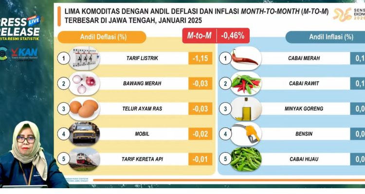 (Beritadaerah-Semarang) Badan Pusat Statistik (BPS) mencatat Jawa Tengah mengalami deflasi (penurunan harga dan jasa) bulan ke bulan atau Month to Month (M-to-M) sebesar -0,46 persen. Kondisi ini, dipengaruhi salah satunya karena diskon tarif listrik 50 persen, yang diterapkan pada awal 2025.