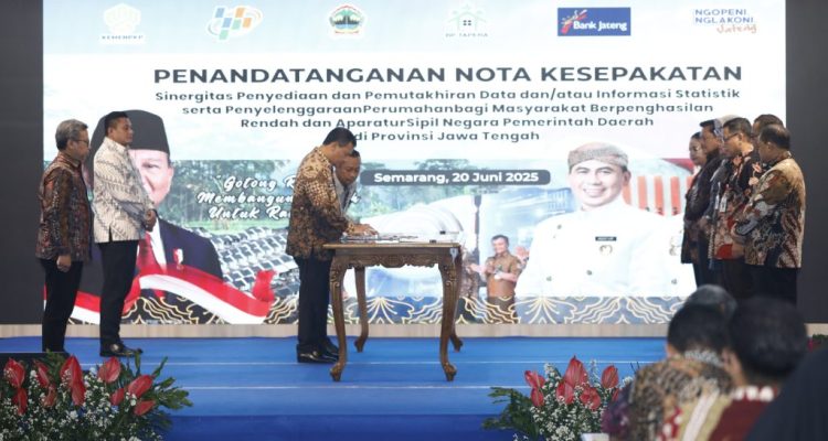 (Beritadaerah-Semarang) Kementerian Perumahan dan Kawasan Permukiman (PKP), bersama dengan Pemerintah Provinsi Jawa Tengah dan 35 bupati/wali kota, BPS RI, Tapera, serta Bank Jateng, melakukan penandatanganan kesepakatan, terkait Penyediaan dan Pemutahkiran Data, Informasi Statistik Penyelenggaraan Perumahan bagi Masyarakat Berpenghasilan Rendah (MBR), dan ASN Pemda di Gedung Gradhika Bhakti Praja, Semarang, Provinsi Jawa Tengah, Jumat (29/6).