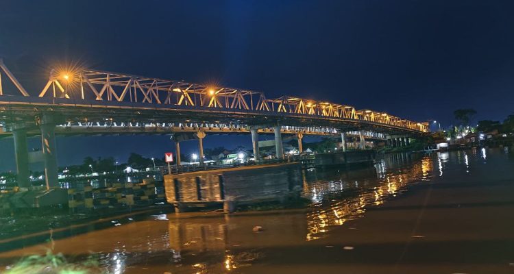 (Beritadaerah-Pontianak) Tampak cahaya dari lampu-lampu yang menghiasi Jembatan Kapuas 1 pada waktu malam di Kota Pontianak, Kalimantan Barat, Selasa (30/9). Foto diambil saat menelusuri Sungai Kapuas dengan kapal wisata. Wisatawan akan dibawa melewati kolong Jembatan Kapuas 1 dan menyaksikan cahaya lampu rumah yang ada di tepi Sungai Kapuas. Wisatawan yang ingin menikmati wisata malam dengan kapal kayu dapat datang ke Dermaga Kapal yang berada Taman Alun-Alun Kapuas.