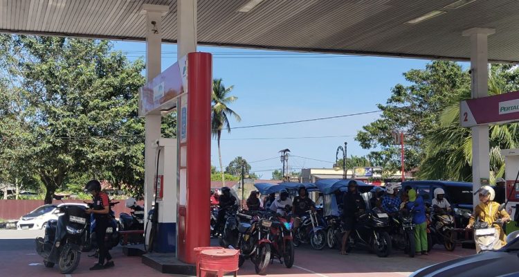 (Beritadaerah-Sofifi) Antrian kendaraan roda dua dan roda empat yang sedang mengisi bahan bakar di SPBU utama yang berada di Kota Sofifi, Tidore Kepulauan, Maluku Utara, Senin siang (20/10). Kendaraan bermotor yang mengisi bahan bakar antri dengan tertib.