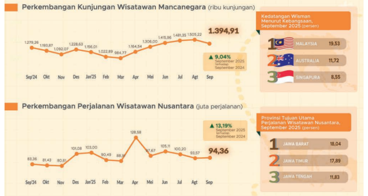(Beritadaerah-Jakarta) Badan Pusat Statistik (BPS) merilis data kunjungan wisatawan mancanegara pada bulan September 2025 di Indonesia mencapai 1,39 juta kunjungan. Jumlah ini turun sebesar 7,33 persen dibandingkan Agustus 2025 month-to-month (m-to-m) tetapi naik 9,04 persen dibandingkan bulan yang sama pada tahun lalu (y-on-y). Wisman yang berkunjung ke Indonesiaiau pada September 2025 didominasi oleh wisman yang berasal dari Malaysia (19,53 persen), Australia (11,72 persen), dan Singapura (8,55 persen).