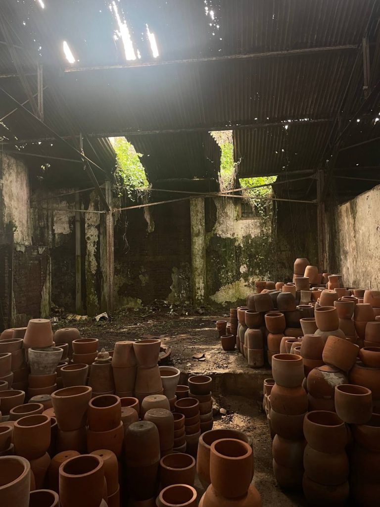 Tampak depan bangunan bagian atas membentuk dinding tinggi bertuliskan “Induk Perusahaan Keramik Plered”. Sementara, dibagian belakangan bangunan, dua cerobong asap menjulang tinggi. Bangunan itu hingga saat ini masih digunakan sebagai tempat produksi kerajinan tangan gerabah keramik Plered. Para pengrajin masih tetap mempertahankan membuat gerabah keramik secara manual.