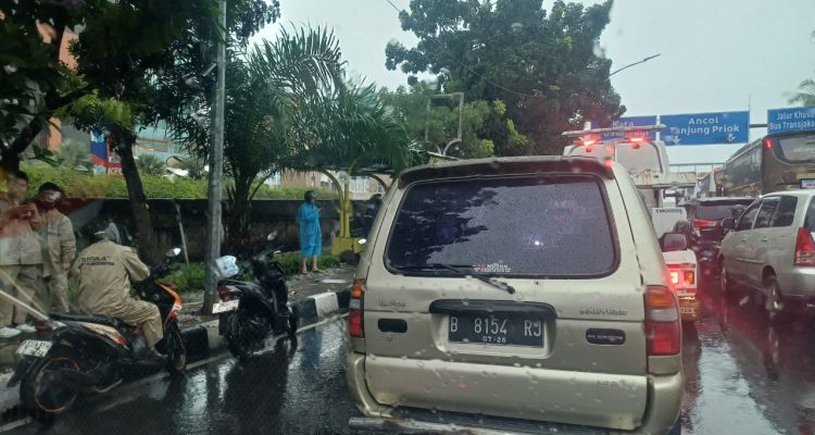 (Beritadaerah-Jakarta) Dampak genangan air di depan Mall Mangga Dua Square, mengakibatkan kemacetan lalu lintas di Depan WTC Mangga Dua, Jakarta Utara, Senin (12/1). Hujan deras yang terjadi pada Senin pagi tanggal 12 Januari 2026 berakibat genangan air dan banjir di beberapa daerah di Kota Jakarta.