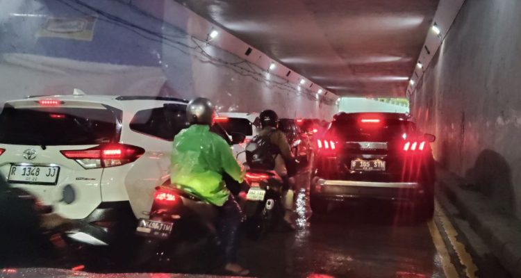 (Beritadaerah-Jakarta) Tampak kendaraan bermotor yang mengalami kemacetan di Underpass Jalan Basuki Rahmat, Jakarta Timur, menuju Tebet. Dampak hujan deras yang terjadi di Jakarta, pada Senin pagi tanggal 12 Januari 2026 membuat sejumlah jalan mengalami genangan air dan kemacetan.