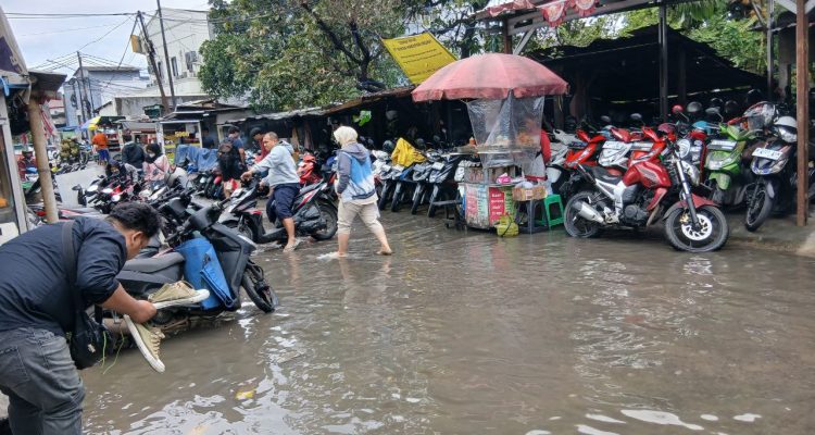 (Beritadaerah-Jakarta) Tampak parkiran motor yang tergenang air di depan Stasiun Rawa Buaya, Jakarta Barat, Senin (12/1). Kondisi ini akibat hujan deras yang terjadi pagi hari di Jakarta.