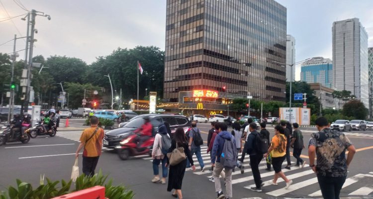 Pekerja Kantor Menyebrang Jalan di MH Thamrin, Jakarta Handi Denyut Sabang MeraukeFeatured January 22, 2026 (Beritadaerah-Jakarta) Para pekerja kantor yang sedang menyebrang jalan di Jalan MH Thamrin, Jakarta Pusat, Rabu (22/1) sore.Foto: Merli/Journalist BD