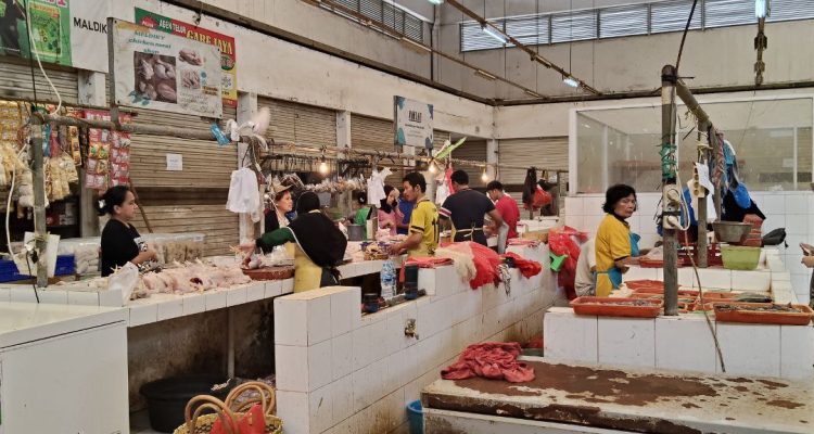 (Beritadaerah-Jakarta) Tampak lapak pedagang ayam potong dan daging yang melayani pengunjung di Pasar Modern Market Jakarta Garden City, Jakarta Timur, Kamis (29/1) pagi. Berbagai bahan kebutuhan pokok, sayuran, buah-buahan, daging, telor dan lainnya tersedia di pasar ini. Hasil pantauan di lapangan untuk harga telor Rp 29 ribu per kg, ayam kampung Rp 75-80 ribu per ekor, ayam negeri Rp 50 ribu per ekor.
