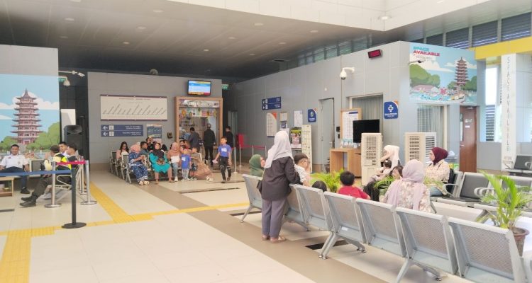 (Beritadaerah-Palembang) Para penumpang yang duduk menunggu kedatangan Light Rail Transit atau LRT di depan loket Stasiun Bandara Sultan Mahmud Badaruddin II Palembang, Sumatera Selatan, Minggu (22/3) sore. Kondisi stasiun tidak begitu ramai dengan calon penumpang.