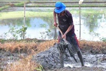 (Beritadaerah-Gorontalo) Seorang petani memperbaiki pematang sawah di Kelurahan Wongkaditi Barat, Kecamatan Kota Utara, Kota Gorontalo, Sabtu (12/10). Pematang sawah diperbaiki...