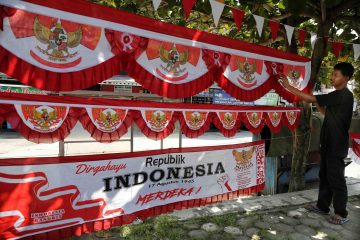 (Beritadaerah-Palangka Raya) Penjual menata pernak-pernik bendera di Jalan Tjilik Riwut, Kota Palangka Raya, Kalimantan Tengah, Kamis (1/8). Jelang peringatan HUT...