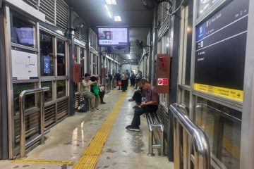 (Beritadaerah-Jakarta) Tampak para penumpang yang sedang menunggu kedatangan bus di Halte Transjakarta Pasar Santa, Jakarta Selatan, Selasa (3/3), pukul 21.00...
