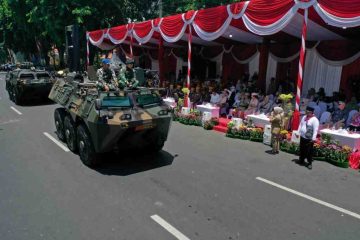 (Beritadaerah-Surabaya) Tampak sejumlah kendaraan alutsista milik Tentara Nasional Indonesia (TNI) melintasi depan panggung kehormatan pada Parade Surabaya Juang 2024 di...