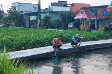(Beritadaerah-Sidoarjo) Warga membersihkan sungai dari tanaman eceng gondok yang menyumbat aliran air di desa Krembangan, Taman, Sidoarjo, Senin (25/3/2024). Selain...