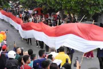 (Beritadaerah – Mojokerto) Tampak para peserta Gerak Jalan Perjuangan Mojokerto-Surabaya (GJP Mojosuro) 2023 mengarak kain merah putih di Lapangan Raden Wijaya Surodinawan, Kota Mojokerto,...