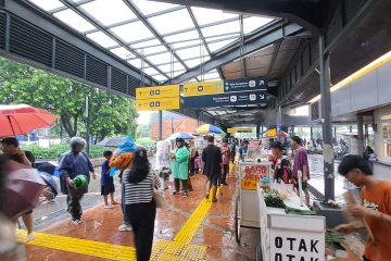 (Beritadaerah-Depok) Tampak para penumpang kereta api sedang menunggu hujan berhenti di Stasiun Depok, Jawa Barat, Sabtu sore (6/7). Foto: Suwandi/Kontributor...
