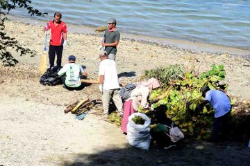(Beritadaerah-Gorontalo) Tampak sejumlah warga bergotong royong membersihkan sampah pada aksi bersih pantai di Pantai Blue Marlin, Kecamatan Dumbo Raya, Kota...